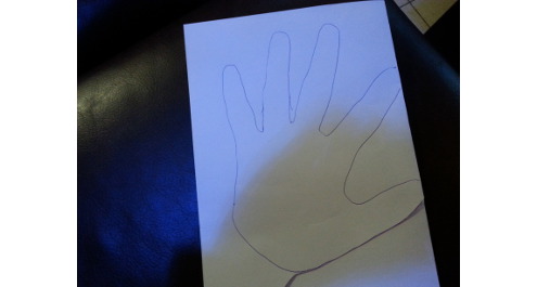 כל שעליכם לעשות הוא לקפל דף לבן לחצי, לצייר קו מסביב לכף היד של הילד כך שהאגודל והאצבע צמודות לקצה המקופל של הדף כמו בציור הבא: