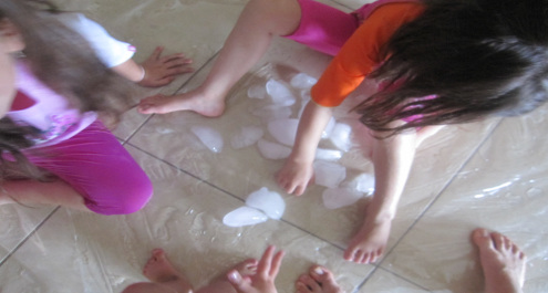 כשמסיימים, מניחים מגבות רגליים מסביב ועם מוזיקה קצבית מתחילים במשחק ההחלקרח: מזמינים את הילדים לקפוץ מעל גושי הקרח (בזהירות...), או ללכת ביניהם. אפשר לכסות את העיניים במטפחת ולתת הוראות לצעידה בקרח ועוד...