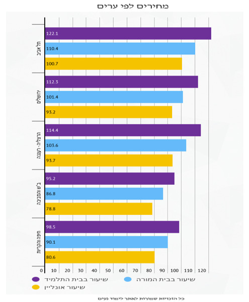 בגרף הבא ניתן לראות את התפלגות מחירי השיעורים הפרטיים לפי ערים מרכזיות בארץ. חשוב לציין שהמחירים שמופיעים הינם ממוצעים.