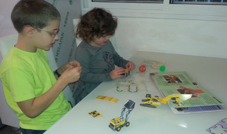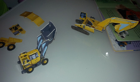 בין דפי הספר הקשיחים נמצאים ארבעה דגמים של מכונות (דחפור, מעמיס תבואה/שופל, משאית עפר ובולדוזר), פשוטים להרכבה: אין צורך בדבק או במספרים, אלא רק להוציא את החלקים ולחבר אותם זה לזה לפי המספרים. ההרכבה בדגמים היא חלק מהלמידה והיא חשובה להורים לא פחות מגימיק ההרכבה.