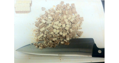 12. את הופלים נחתוך לקוביות קטנות, וחלק נחתוך לחצאים שישמשו לקישוט המנה.