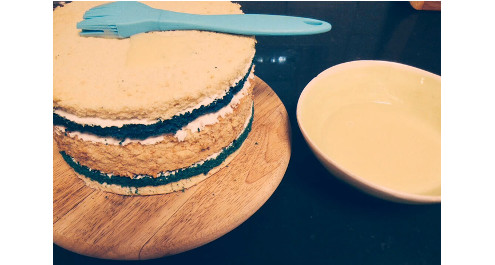 ו. מניחים את העוגה הכחולה השנייה, מורחים קצפת ומחליקים בעזרת פלטה.