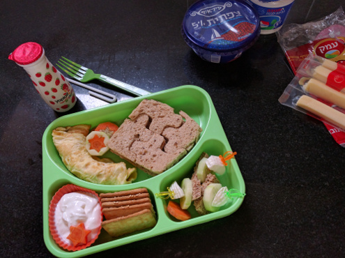 הכריך יהיה בצורת חתיכת פאזל (שוב, נעזר כמובן בחותכן המגניב) בתוכו נמלא טונה מעורבבת עם ביצה קשה ומעט מיונז, ונצרף מקלות של ירקות במבחר צבעים וטעמים, אם הילד לומד עד שעה מאוחרת, אפשר להוסיף גם גבינה לבנה 5 אחוז וקרקרים לצידה, לתגבור בשעות של רעב קל, עד שיגיע הביתה לארוחת צהרים.