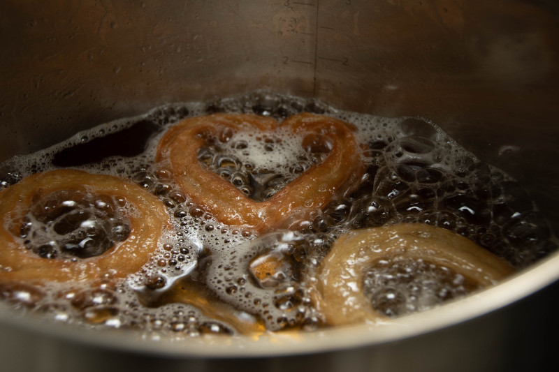 מזלפים את העיסה לתוך השמן המחומם, באורך של כ10 ס"מ, חותכים את העיסה מהמזלף בעזרת סכין. מטגנים עד לקבלת צבע זהוב, מוצאים מהשמן ומניחים על נייר סופג.