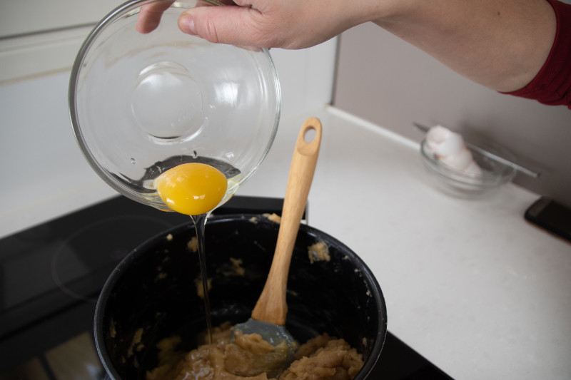 1. מכניסים את המים, סוכר, חמאה ומלח לסיר בינוני. מביאים את התערובת לרתיחה ומנמיכים לאש קטנה. מוסיפים את הקמח ומערבבים היטב עד לקבלת תערובת אחידה. מבשלים את התערובת כ2 דקות תוך כדי ערבוב תמידי.