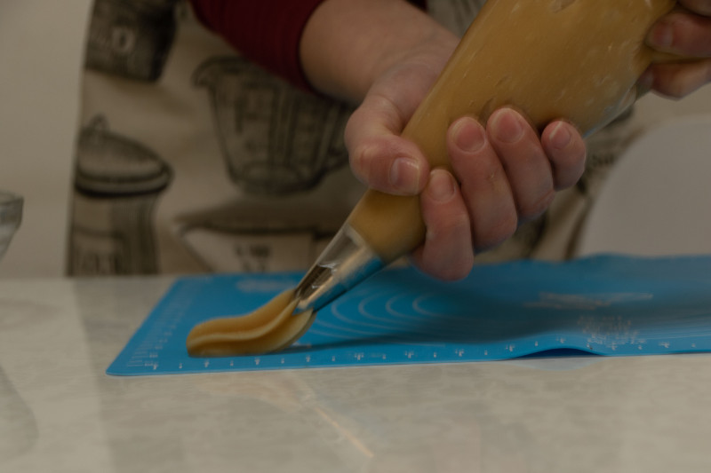 4. מחממים סיר עם שמן לחום של 140-150°C. מעבירים את העיסה לשקית זילוף מאובזר במזלף בצורת כוכב.