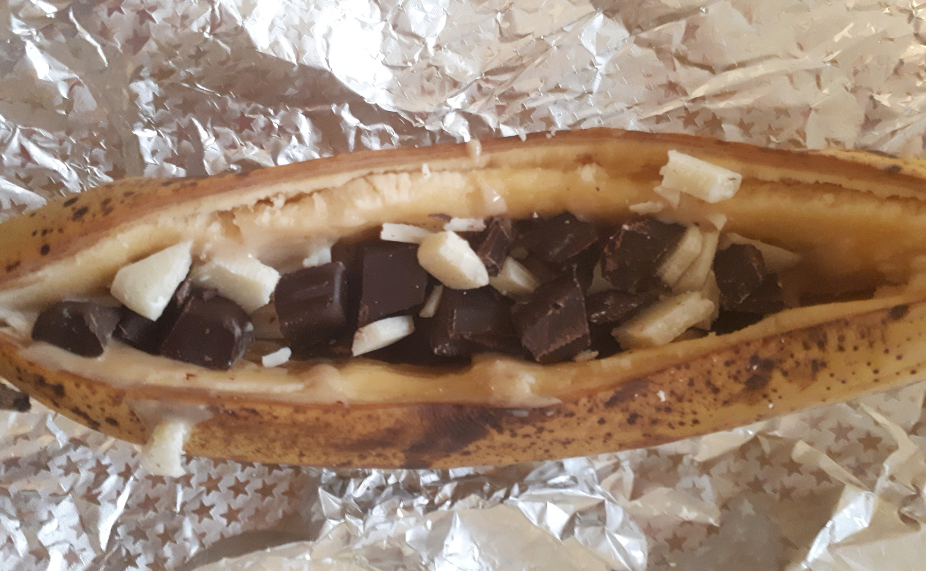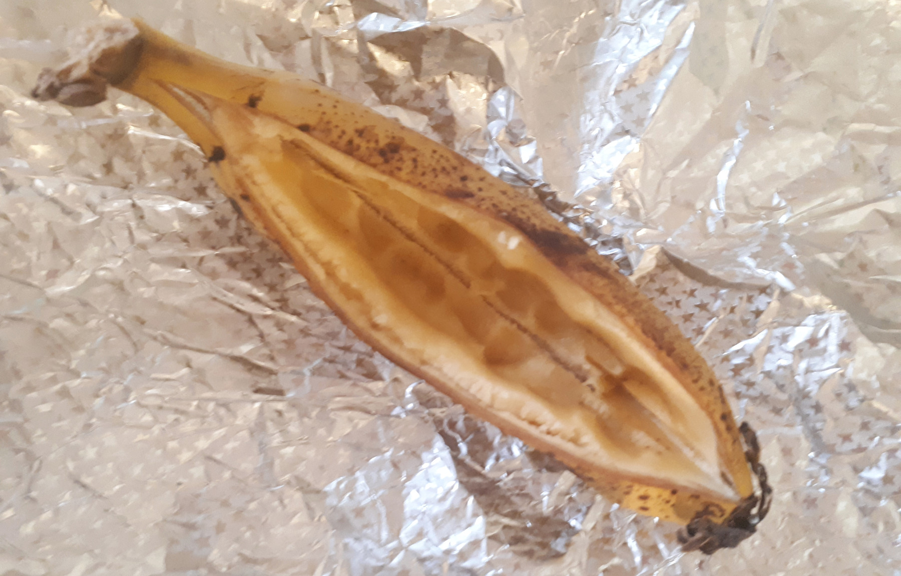 מוציאים, מקלפים בזהירות את נייר הכסף ואת קליפת הבננה