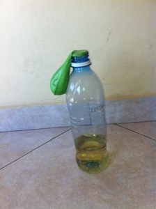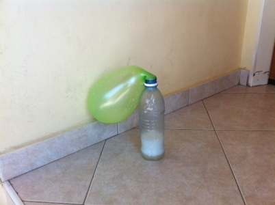 המגע של החומץ עם הסודה לשתיה יצר גז שקוף שניפח את הבלון.
