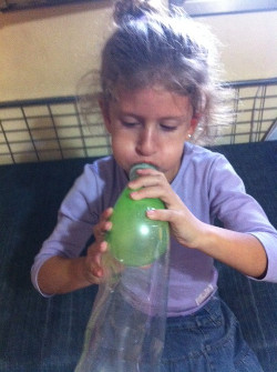 הלבישו את הבלון על פתח הבקבוק ונסו לנפח אותו.