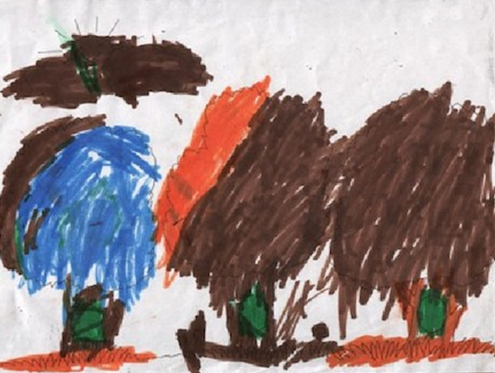 ציוריו של נדב (שם בדוי) בן השבע, משקפים סיפור שכזה. הוריו מתלוננים על כך שהוא מכה אותם אפילו ליד אנשים זרים. הסיבה למכה יכולה להיות פעוטה כמו שאלה שנשאל ושלא רצה להשיב עליה, כי לא הרשו לו דבר מה שרצה מאוד וכד‘.