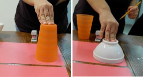על אחד מהגליונות משרטטים עיגול עם הכלי הגדול יותר ובתוך העיגול ששרטטנו משרטטים את העגול הקטן.