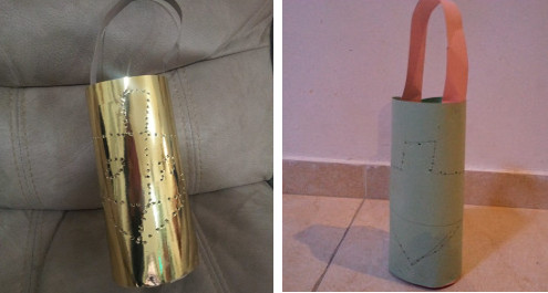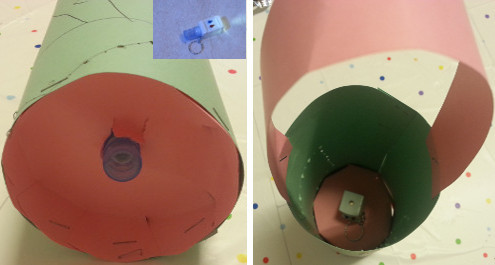 מכניסים לתוך הלמפיון פנס קטן. אנחנו השתמשנו בפנס "מי-עדן" פשוט שקנינו בשקל אחד בחנות "הכל בשקל", וגם עשינו חור קטנטן בתחתית הלמפיון שבו הכנסנו את הפנס.