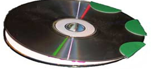 הדביקו את הדיסקים זה אל זה בשוליהם. השתמשו במדבקות הקטנות או בפיסות של נייר דבק. מומלץ להדביק את הדיסקים בשמונה נקודות לפחות. (הדיסקים יתכופפו מעט).