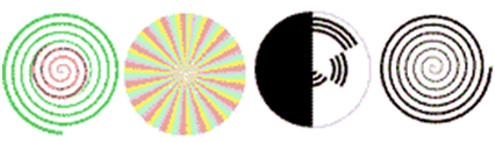 דיסקי הספירלה ממחישים אשלייה אחרת בקשורה לתנועה מדומה ומכונה Barber pole (עמודי הסַפָּר, על שם עמודים מסתובבים ועליהם ספירלות שיצרו תחושה של טבעות עולות או יורדות. על פי האגדה עמודים אלה היו מקובלים בכניסה למספרות במערב הפרוע). כאשר מסתכלים על טבעות הספירלה קל יותר לעין להתמקד בקו ההפרדה שבין הספירלה השחורה לרקע הלבן ולא באזור שחור (או לבן). כתוצאה מכך התחושה הנוצרת היא של קו הפרדה בצורת טבעת המתרחק (או מתקרב למרכז) ולא של אזורים שחורים הנעים במסלול מעגלי.