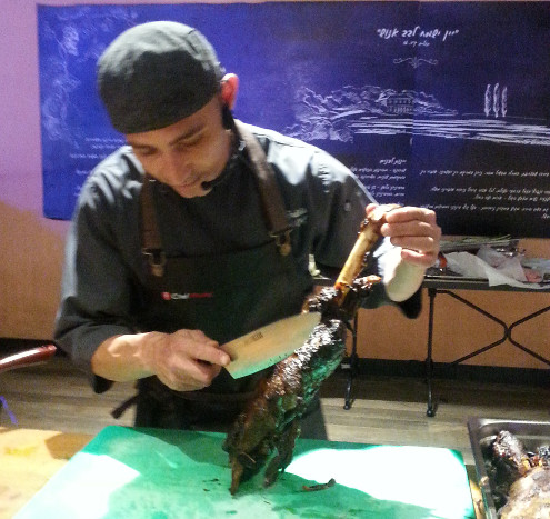 * לאחר שהירקות צלויים מניחים בכלי הגשה ומעל מניחים את הכתף טלה בשלמותה.