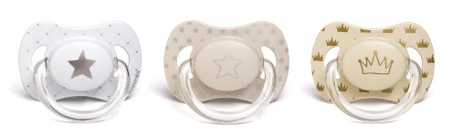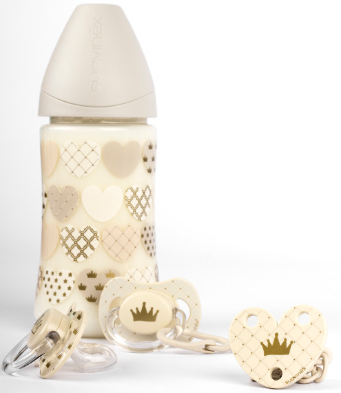 מוצצים אנטומיים במידה 0 -6, 6+ ב-4 עיצובים שונים. כמו כן, 4 קליפסים בעיצובים ייחודיים, 3 בקבוקים בנפח 270 מ"ל עם פטמה רב שלבית, נשכן לב בקופסה ורעשן לב.