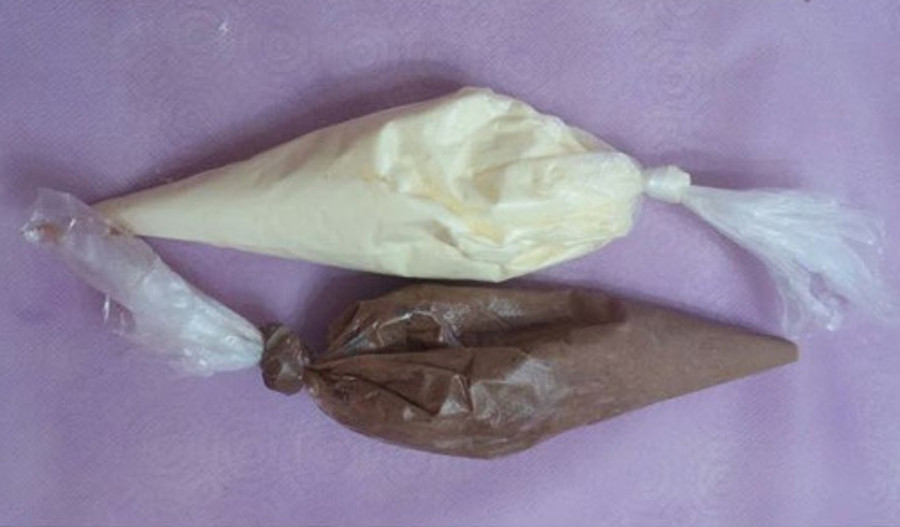 4. מורחים בקצה אחד של כל ביסקוויט מתערובת הוניל ובקצה השני מתערובת השוקולד. מניחים מעליו ביסקוויט נוסף ומהדקים קלות. בעזרת סכין מסירים את שאריות הקרם מסביב ומסדרים בתבנית.